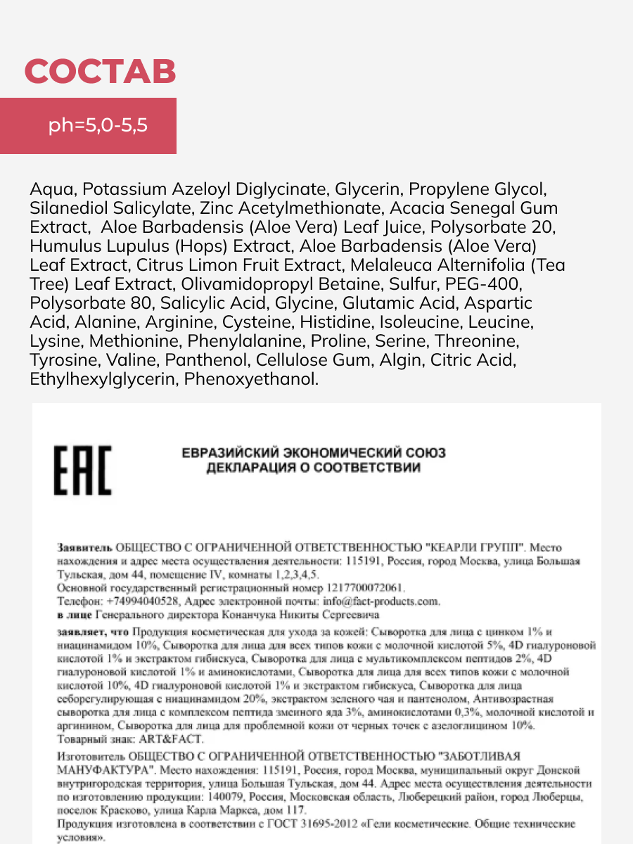 Aqua, Potassium Azeloyl Diglycinate, Glycerin, Propylene Glycol, Silanediol Salicylate, Zinc Acetylmethionate, Acacia Senegal Gum Extract, Aloe Barbadensis (Aloe Vera) Leaf Juice, Polysorbate 20, Humulus Lupulus (Hops) Extract, Aloe Barbadensis (Aloe Vera) Leaf Extract, Citrus Limon Fruit Extract, Melaleuca Alternifolia (Tea Tree) Leaf Extract, Olivamidopropyl Betaine, Sulfur, PEG-400, Polysorbate 80, Salicylic Acid, Glycine, Glutamic Acid, Aspartic Acid, Alanine, Arginine, Cysteine, Histidine, Isoleucine, Leucine, Lysine, Methionine, Phenylalanine, Proline, Serine, Threonine, Tyrosine, Valine, Panthenol, Cellulose Gum, Algin, Citric Acid, Ethylhexylglycerin, Phenoxyethanol.