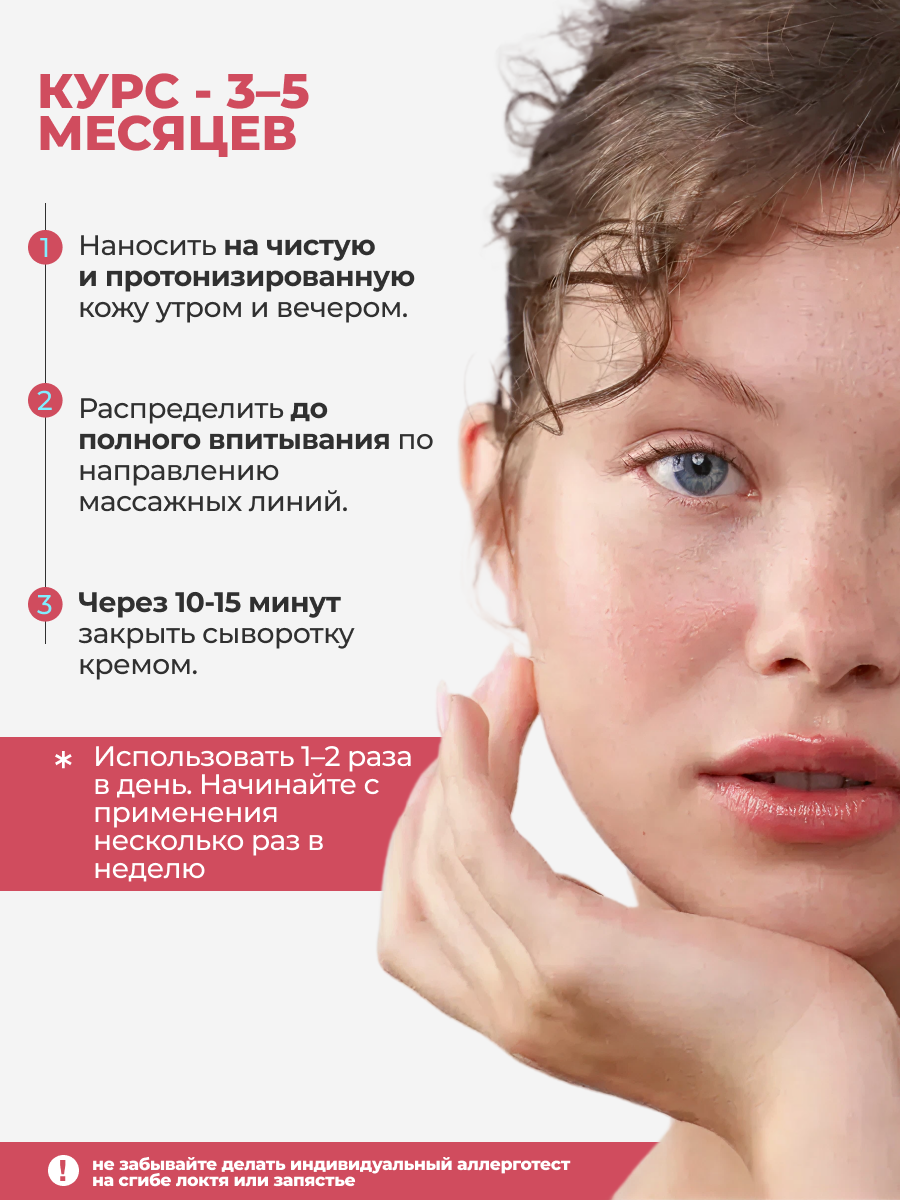 Нанести на чистую, протонизированную кожу легкими движениями по массажным линиям. Закрывать кремом через 5–10 минут. Использовать утром и/или вечером. Рекомендованный курс 3 месяца. Перед применением рекомендуется провести кожную пробу на локтевом сгибе.