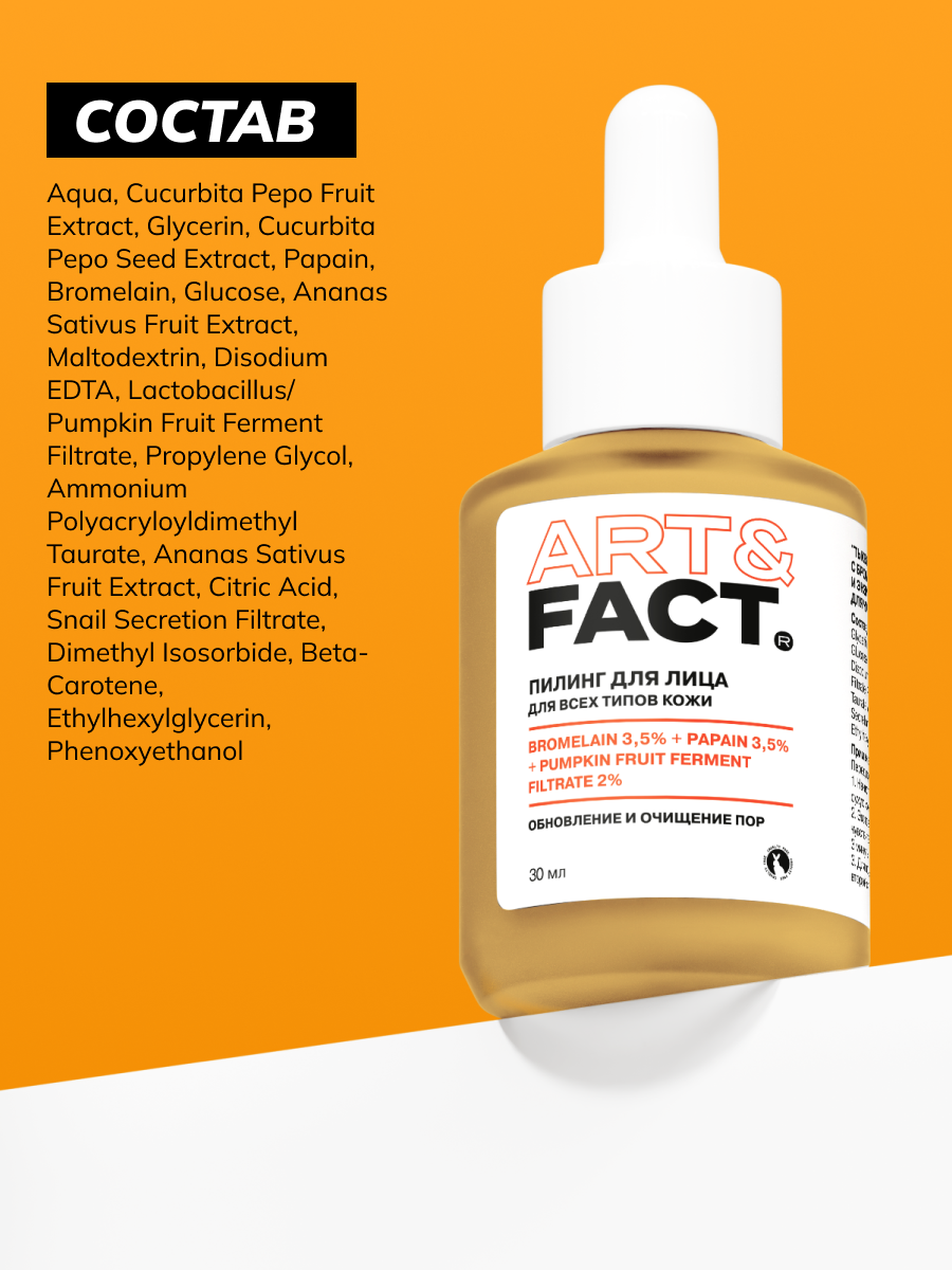 Aqua, Cucurbita Pepo Fruit Extract, Glycerin, Cucurbita Pepo Seed Extract, Papain, Bromelain, Glucose, Ananas Sativus Fruit Extract, Мaltodextrin, Disodium EDTA, Lactobacillus/Pumpkin Fruit Ferment Filtrate, Propylene Glycol, Ammonium Polyacryloyldimethyl Taurate, Ananas Sativus Fruit Extract, Citric Acid, Snail Secretion Filtrate, Dimethyl Isosorbide, Beta-Carotene, Ethylhexylglycerin, Phenoxyethanol.