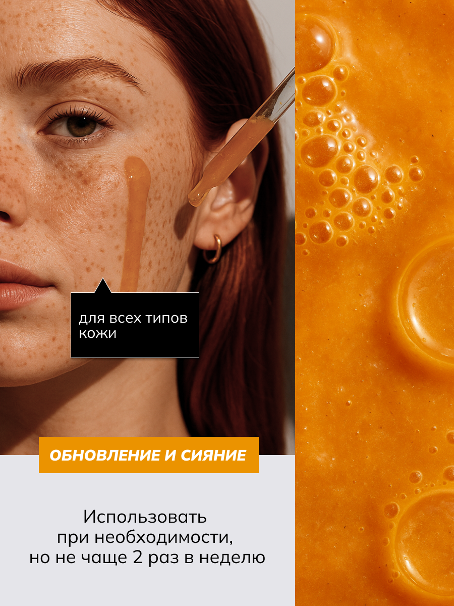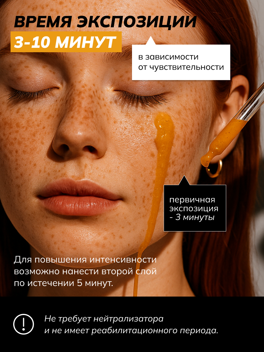 Нанести пилинг равномерным слоем на очищенную сухую кожу лица. Экспозиция — 3–10 минут в зависимости от степени чувствительности кожи, первичная экспозиция — 3 минуты. Для повышения интенсивности возможно нанести второй слой по истечении 5 минут. Смыть водой. Использовать 1-2 раза в неделю. Допускается ощущение кратковременного покалывания.