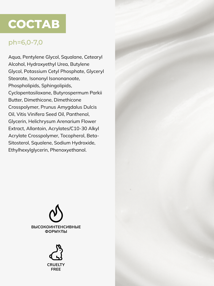 Aqua, Caprylic/Capric Triglyceride, Butyrospermum Parkii (Shea) Butter, Prunus Amygdalus Dulcis (Sweet Almond) Oil, Squalane, Allantoin, Panthenol, Hydroxyethyl Urea, Dimethicone, Sodium Polyacryloyldimethyl Taurate, Hydrogenated Polydecene, Trideceth-10, Glyceryl Stearate, Cetearyl Alcohol, Sodium Lauroyl Glutamate, Sodium Stearoyl Lactylate, Glucosyl Ceramide, Phospholipids, Tocopheryl Acetate, Cholesterol, Olea Europaea (Olive) Fruit Oil, Glycerin, Ceramide NP, Polyglyceryl-10 Laurate, Citric Acid, Tocopherol, Helichrysum Italicum (Everlasting) Extract, Phenoxyethanol, Sodium Hyaluronate, Ethylhexylglycerin.