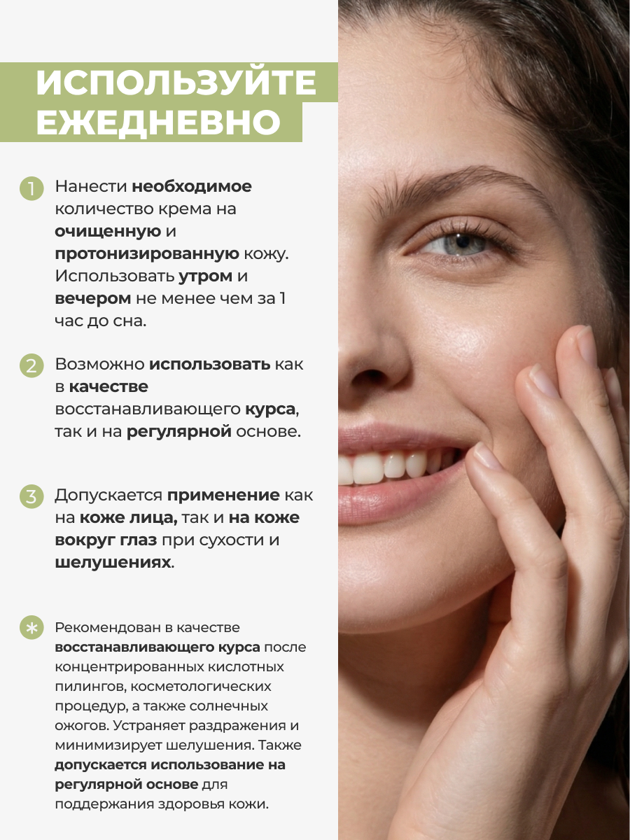 1. Нанести крем на очищенную и протонизированную кожу.