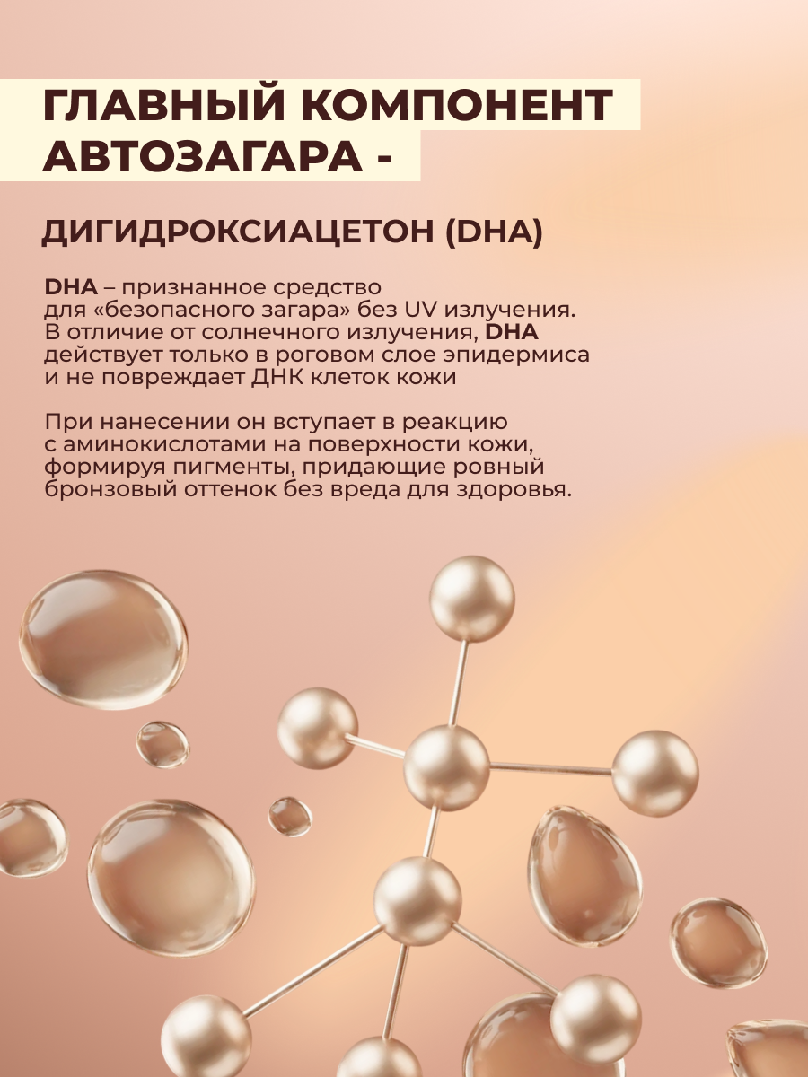 В основе формулы – дигидроксиацетон растительного происхождения. Он вступает в реакцию с аминокислотами рогового слоя кожи, благодаря чему появляется ровный, естественный оттенок загара – без солнца и УФ-стресса.