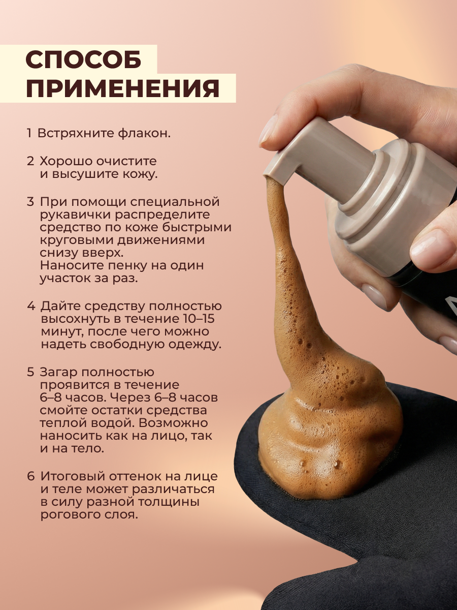 Смываемая тонировка мусса помогает равномерно распределить средство по коже. Загар проявляется постепенно и держится до естественного обновления кожи.