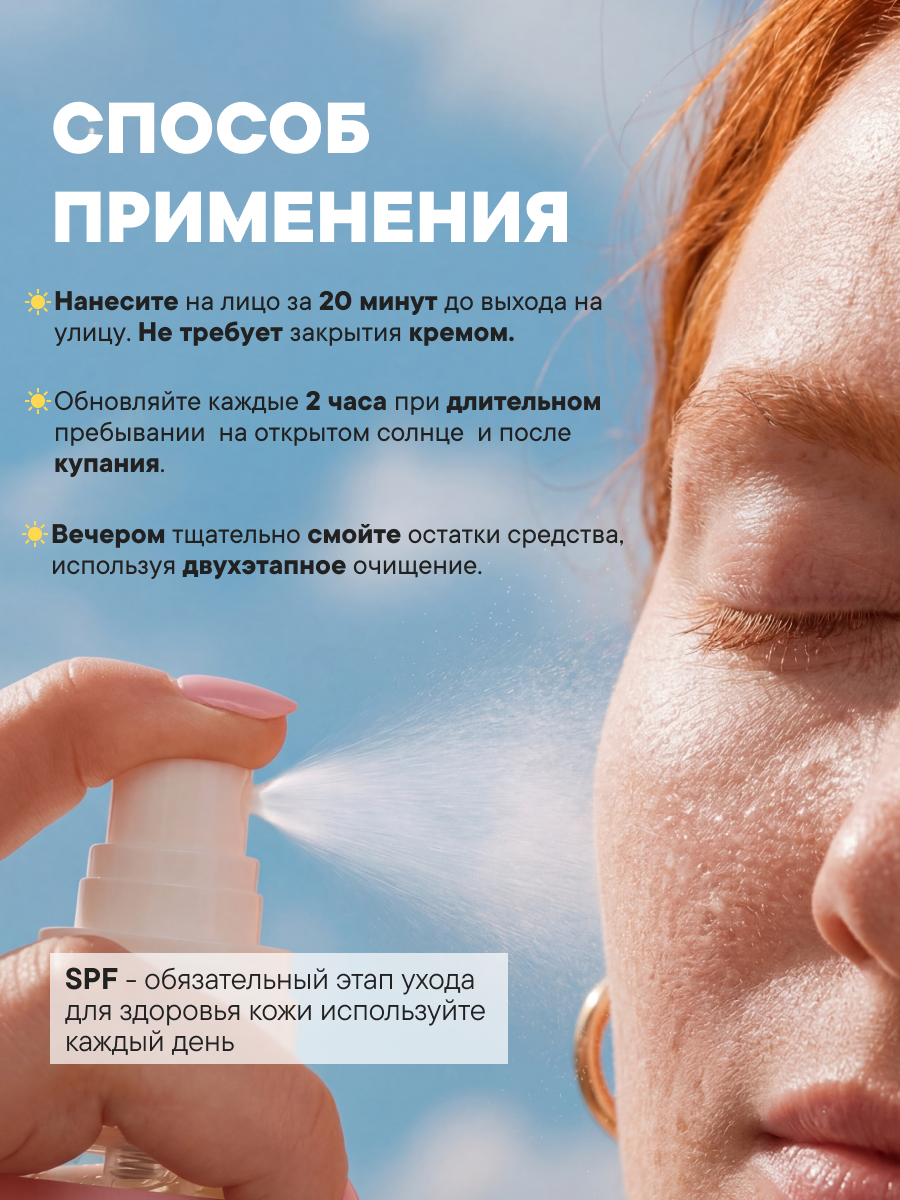 Встряхните флакон для равномерного смешивания. Распылите на кожу за 20 минут до выхода на улицу. Обновляйте каждые 2 часа при активном солнце и после купания. Вечером тщательно смойте остатки средства, для лица используйте двухэтапное очищение.