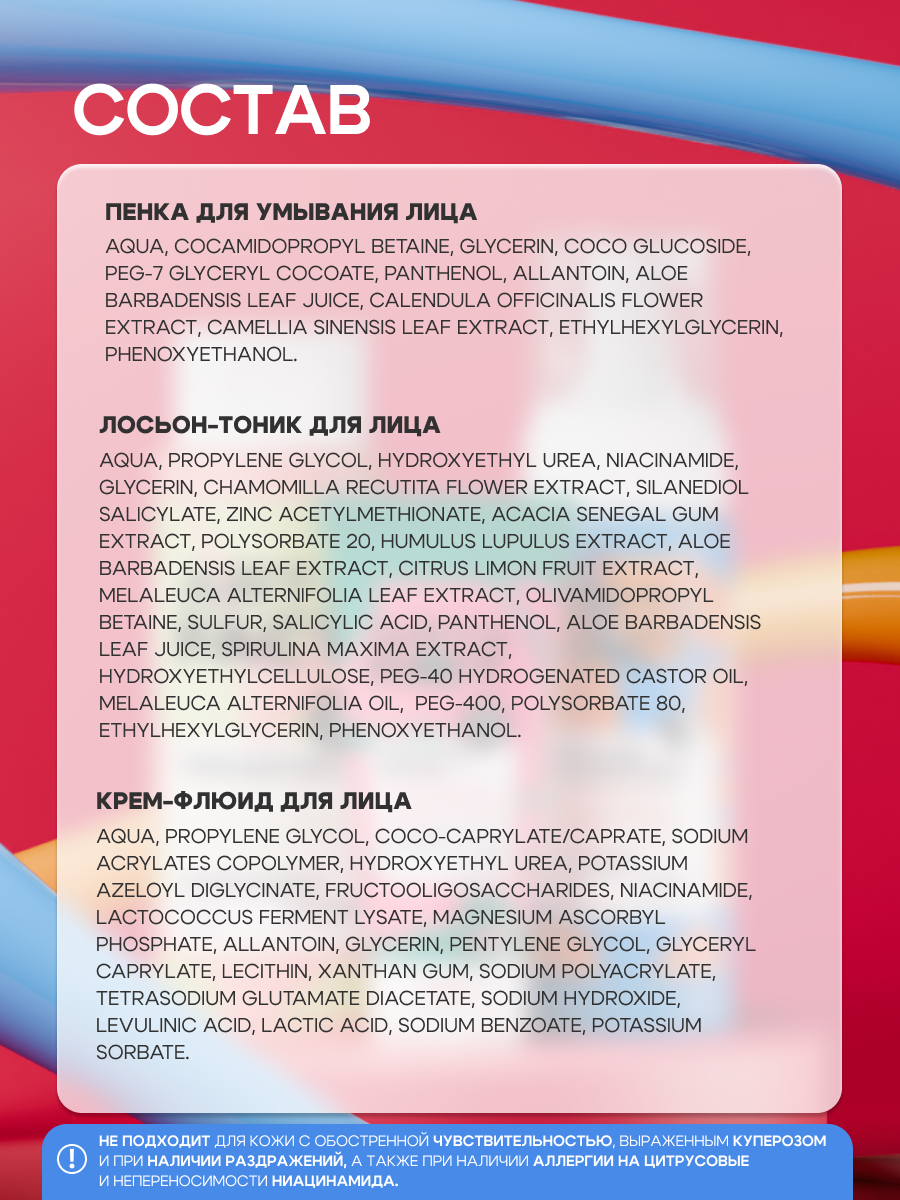 2. Тоник для лица: Aqua, Propylene Glycol, Hydroxyethyl Urea, Niacinamide, Glycerin, Chamomilla Recutita Flower Extract, Silanediol Salicylate, Zinc Acetylmethionate, Acacia Senegal Gum Extract, Polysorbate 20, Humulus Lupulus Extract, Aloe Barbadensis Leaf Extract, Citrus Limon Fruit Extract, Melaleuca Alternifolia Leaf Extract, Olivamidopropyl Betaine, Sulfur, Salicylic Acid, Panthenol, Aloe Barbadensis Leaf Juice, Spirulina Maxima Extract, Hydroxyethylcellulose, PEG-40 Hydrogenated Castor Oil, Melaleuca Alternifolia Oil, PEG-400, Polysorbate 80, Ethylhexylglycerin, Phenoxyethanol.