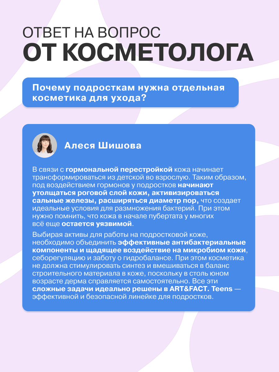 Мы предлагаем готовую схему ухода за подростковой кожей из 3 базовых продуктов и 1 SOS-продукта для лица. Однако при серьезных кожных отклонениях в подростковый период и при желании усилить уход важно подбирать активы совместно с врачом-дерматологом, не опираясь на систему конфликтов на сайте.