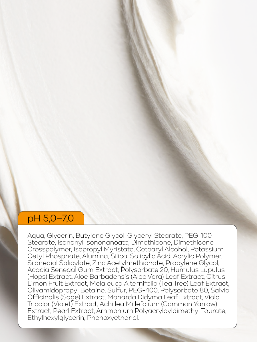 Aqua/Water, Glycerin, Dimethicone, Magnesium Aluminum Silicate, Titanium Dioxide, Quartz, Isopropyl Myristate, Divinyldimethicone/Dimethicone Copolymer, C12-13 Pareth-23, C12-13 Pareth-3, Butylene Glycol, Glyceryl Stearate Citrate, Magnesium Stearate, Sodium Polyacrylate, Cyclopentasiloxane, Trideceth-6, PEG/PPG 18/18 Dimethicone, Dehydroacetic Acid, Benzyl Alcohol, Cocamidopropyl Dimethylamine, Salicylic Acid, Isodecyl Neopentanoate, Dimethicone/Bis-Isobutyl PPG-20 Crosspolymer, Polyacrylate Crosspolymer-6, Magnezium Aspartate, Zinc Gluconate, Copper Gluconate, Disodium Edta, Polysorbate 80, Batyl Alcohol, Stearic Acid, Lecithin, Caprylic/Capric Triglyceride, Glycerol, Erythritol, Hibiscus Sabdariffa Fruit Extract, Salicylic Acid, Pearl Extract, Punica Granatum Seed Oil, Hydrolyzed Yeast Extract, Adenosine Phosphate, Disodium Uridine Phosphate, Disodium Guanylate, Polyglyceryl-10 Dipalmitate, Sunflower Seed Oil, Polyglyceryl-6 Esters, Apricot Kernelate Seed Oil, Sorbitan Oleate, Dicetyl Phosphate.