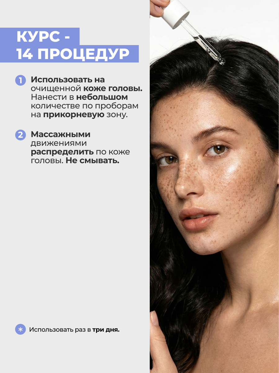 Концентрированная сыворотка для роста волос содержит в себе действенные компоненты, стимулирующие работу луковиц. Никотиновая кислота для волос способствует расширению периферийных кровеносных сосудов, усиливая кровообращение и улучшая транспортировку питательных веществ к волосяным фолликулам. Трипептид меди увеличивает луковицы в диаметре, повышает густоту волос и скорость их роста. Таким образом, несмываемая сыворотка помогает от выпадения волос и стимулирует их ускоренный рост.