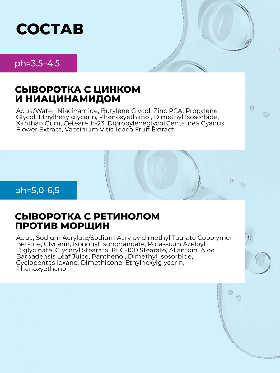 2. Сыворотка для лица с цинком и ниацинамидом: Aqua, Niacinamide, Butylene Glycol, Propylene Glycol, Glycerin, Zinc PCA, Dimethyl Isosorbide, Centaurea Cyanus (Cornflower) Flower Extract, Vaccinium Vitis-Idaea (Lingonberry) Fruit Extract, Xanthan Gum, Ethylhexylglycerin, Phenoxyethanol.
