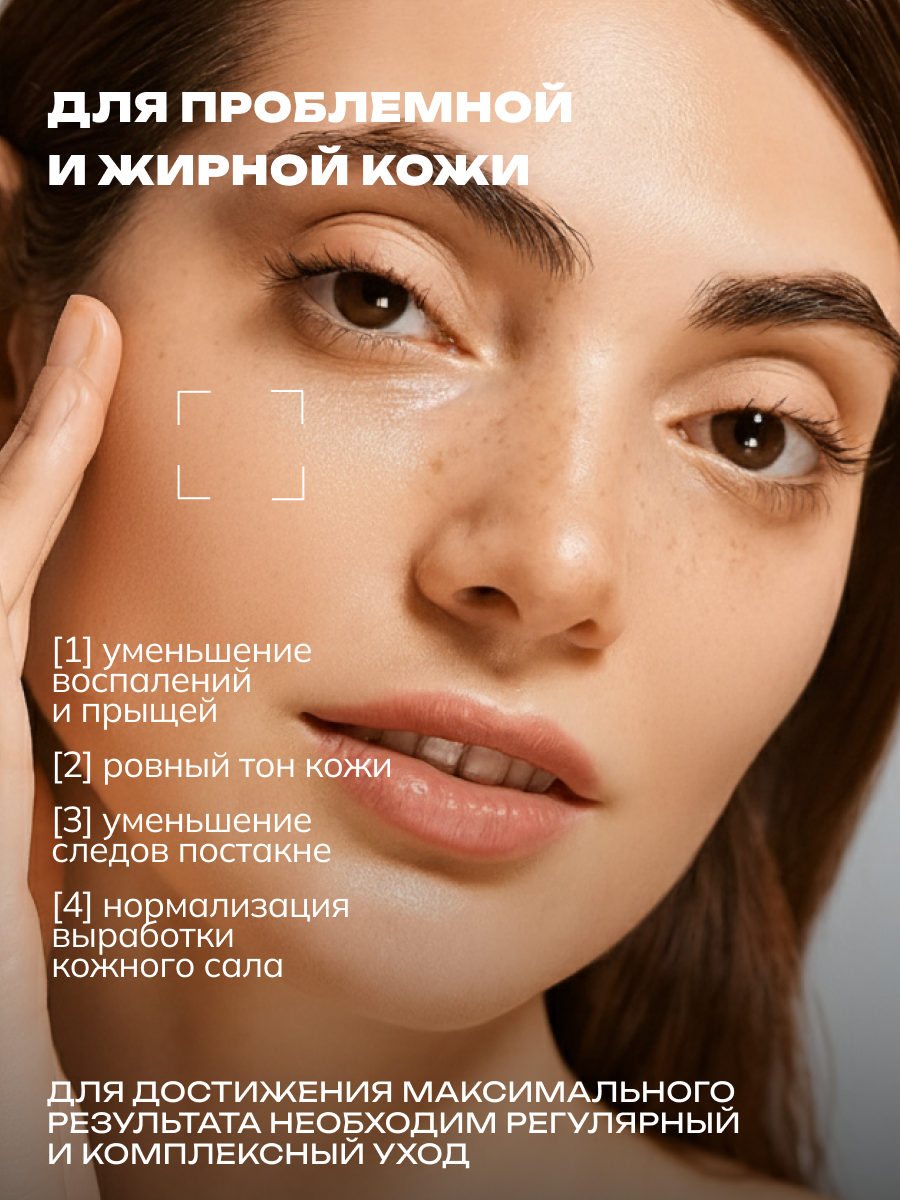 - Доп. уход: SALICYLIC ACID 2% + ZINC OXIDE 0,5% + SQUALANE 0,5%+ ALLANTOIN 0,2%. Использовать Ежедневно, Локально, Утром и/или вечером