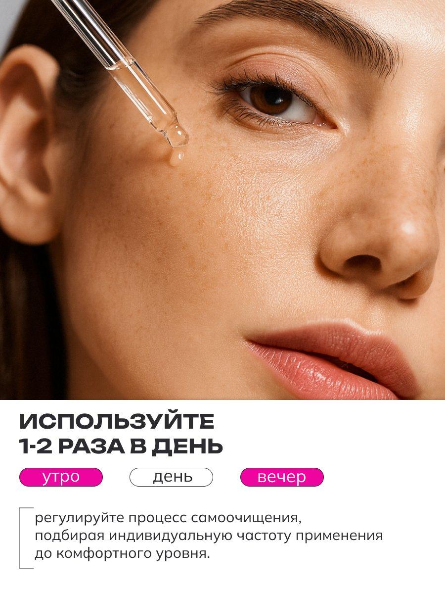 - Очищение: AZELAMIDE 3% + LACTIC ACID 3% + BETAINE 2%. Использовать Ежедневно, Утром и вечером