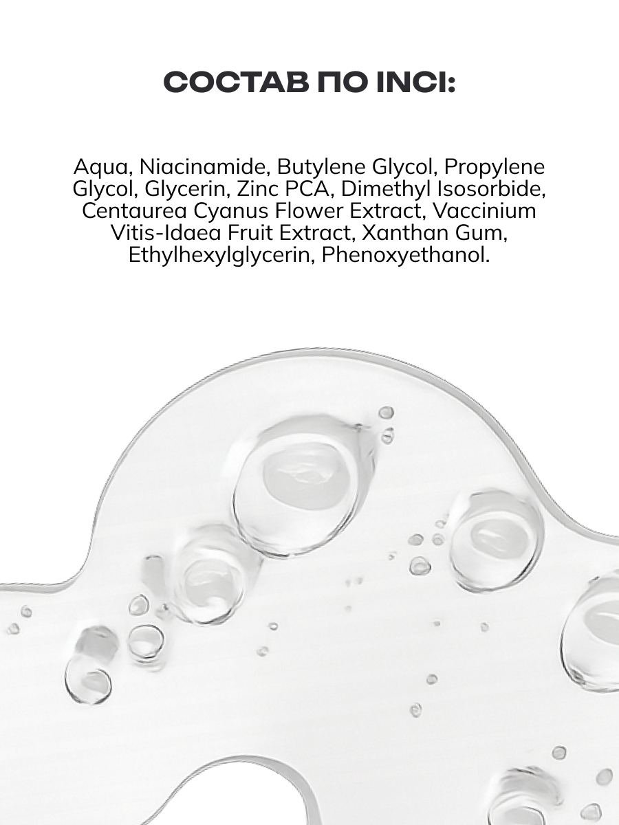 Aqua, Niacinamide, Butylene Glycol, Propylene Glycol, Glycerin, Zinc PCA, Dimethyl Isosorbide, Centaurea Cyanus Flower Extract, Vaccinium Vitis-Idaea Fruit Extract, Xanthan Gum, Ethylhexylglycerin, Phenoxyethanol