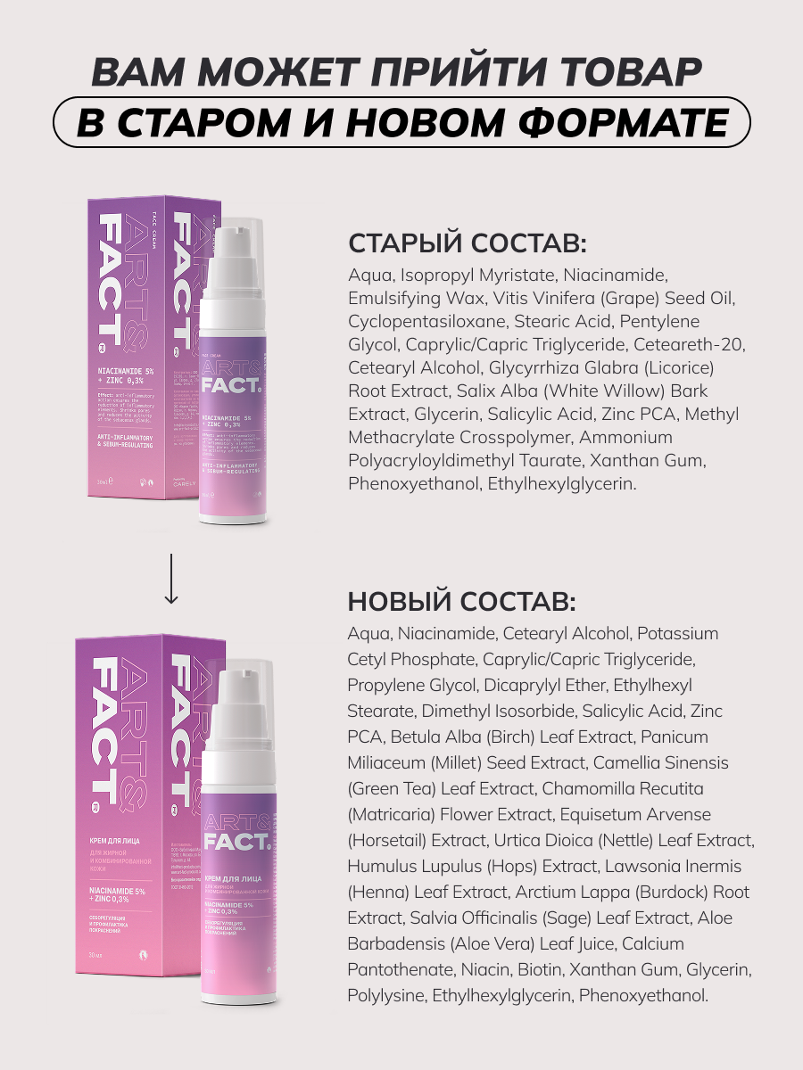 - Крем для лица 1: NIACINAMIDE 5% + ZINC 0,3%. Использовать Ежедневно, Утро