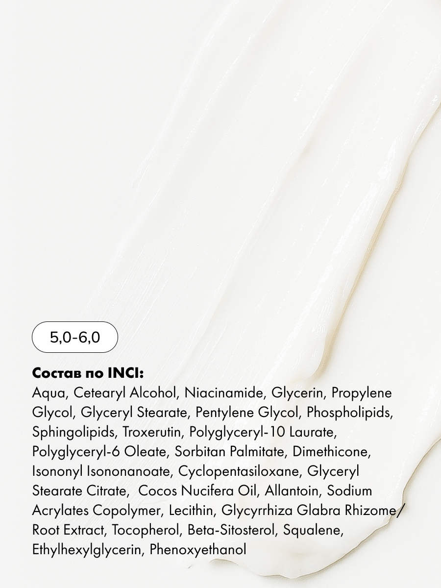 Aqua, Cetearyl Alcohol, Niacinamide, Glycerin, Propylene Glycol, Glyceryl Stearate, Pentylene Glycol, Phospholipids, Sphingolipids, Troxerutin, Polyglyceryl-10 Laurate, Polyglyceryl-6 Oleate, Sorbitan Palmitate, Dimethicone, Isononyl Isononanoate, Cyclopentasiloxane, Glyceryl Stearate Citrate, Cocos Nucifera Oil, Allantoin, Sodium Acrylates Copolymer, Lecithin, Glycyrrhiza Glabra Rhizome/Root Extract, Tocopherol, Beta-Sitosterol, Squalene, Ethylhexylglycerin, Phenoxyethanol