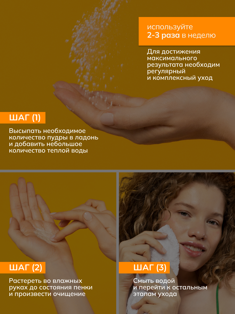 Высыпать необходимое количество пудры в руки. Добавить небольшое количество теплой воды. Растереть до состояния пенки и нанести на влажную кожу лица. Массировать кожу лица 2–3 минуты, после чего смыть водой. Для более интенсивного воздействия нанести порошок непосредственно на влажную кожу лица и помассировать.