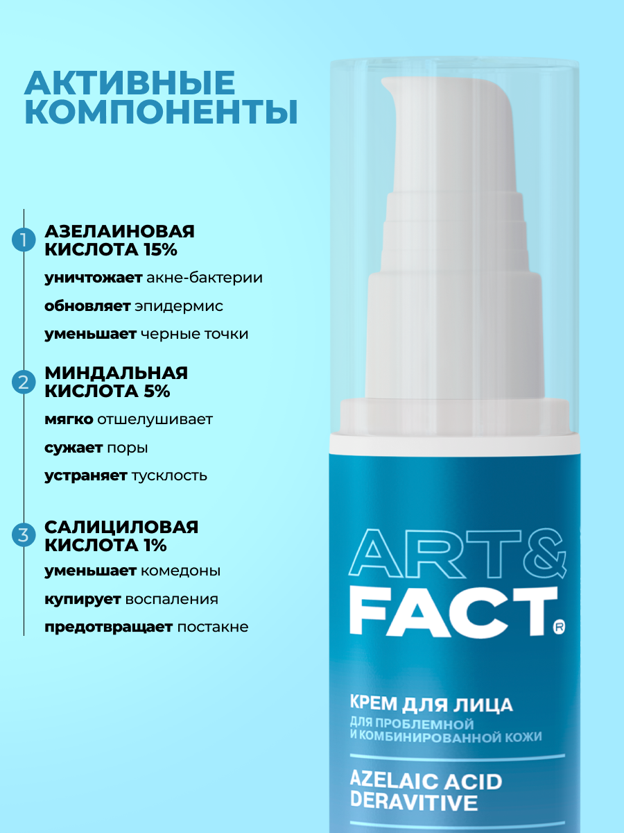 Азелоглицин обладает себорегулирующим действием, способствуя очищению пор, а также удаляет ороговевшие клетки кожи, предотвращает появление пигментных пятен и уменьшает существующие, способен значительно уменьшить следы от угревой сыпи. Некомедогенный крем обладает антиоксидантными свойствами за счет аллантоина. В результате крем способствует выравниванию тона и устранению несовершенств.