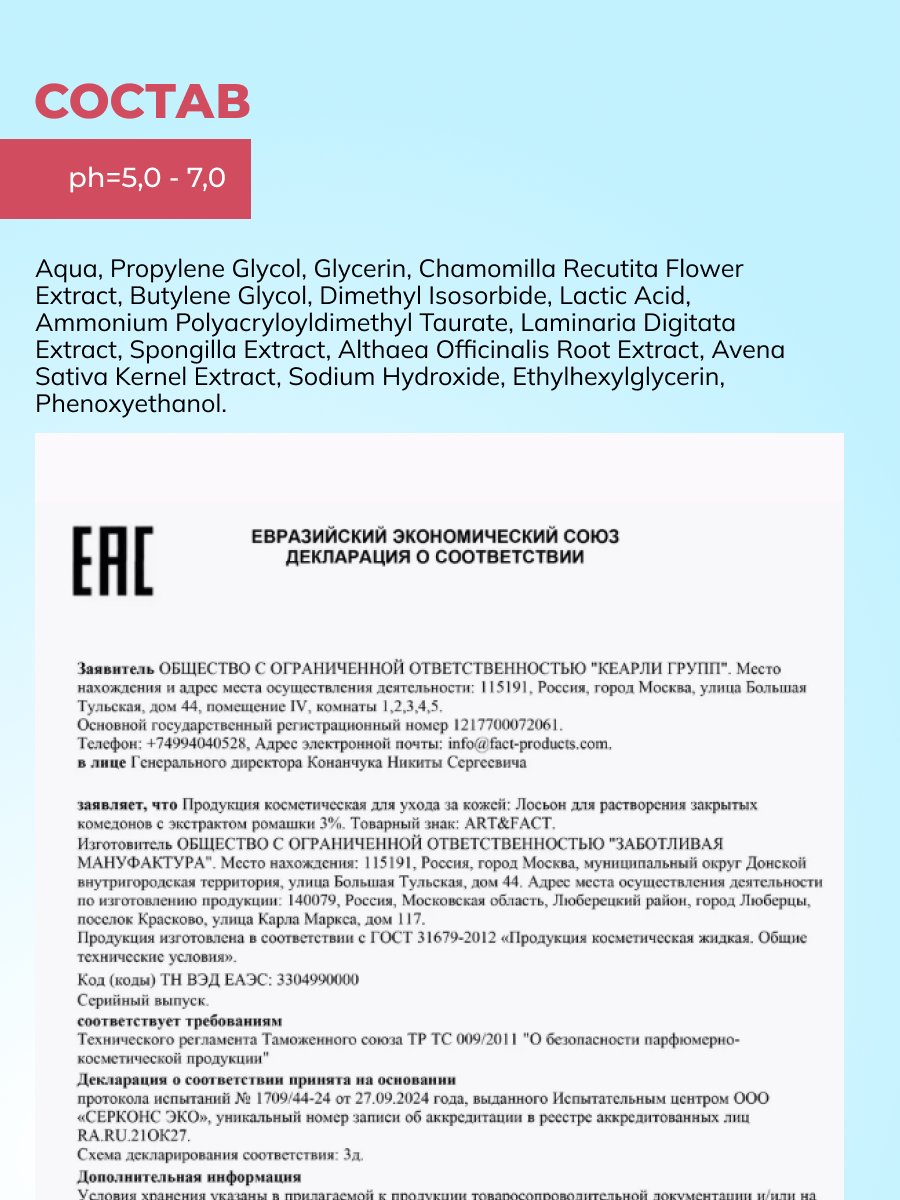 Aqua, Propylene Glycol, Glycerin, Chamomilla Recutita Flower Extract, Butylene Glycol, Dimethyl Isosorbide, Lactic Acid, Ammonium Polyacryloyldimethyl Taurate, Laminaria Digitata Extract, Spongilla Extract, Althaea Officinalis Root Extract, Avena Sativa Kernel Extract, Sodium Hydroxide, Ethylhexylglycerin, Phenoxyethanol.