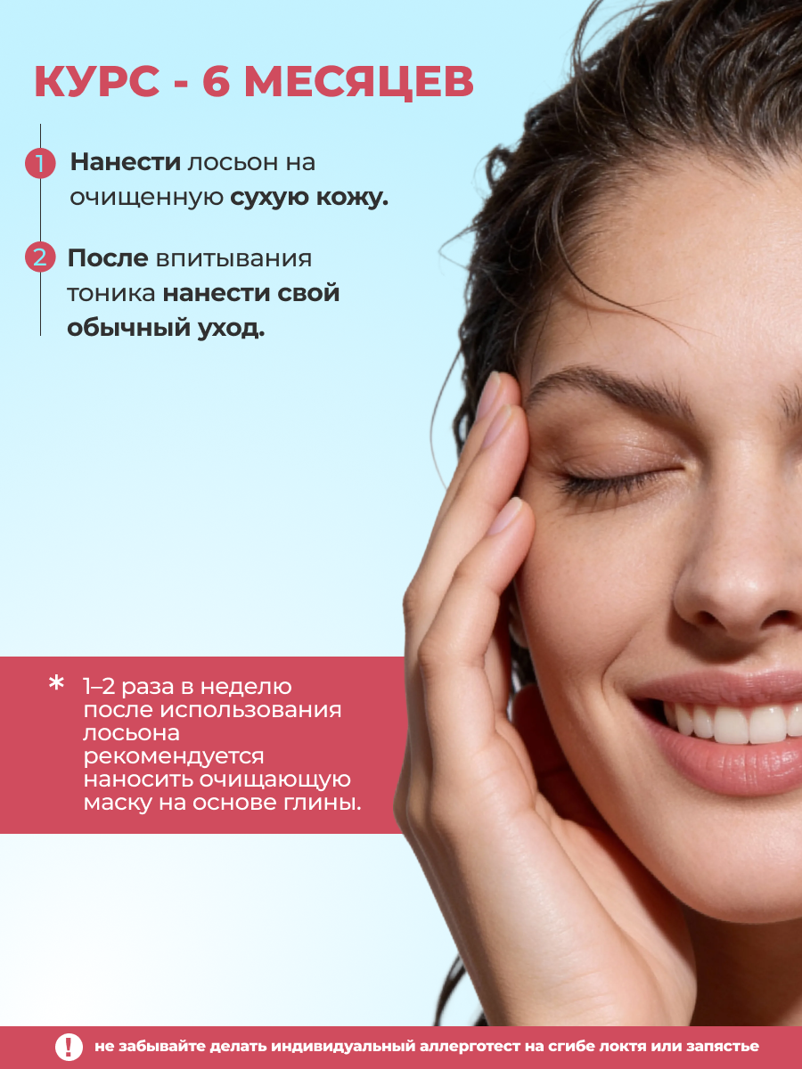 Нанести лосьон на очищенную сухую кожу. После впитывания тоника нанести свой обычный уход. Использовать 1–2 раза в день.