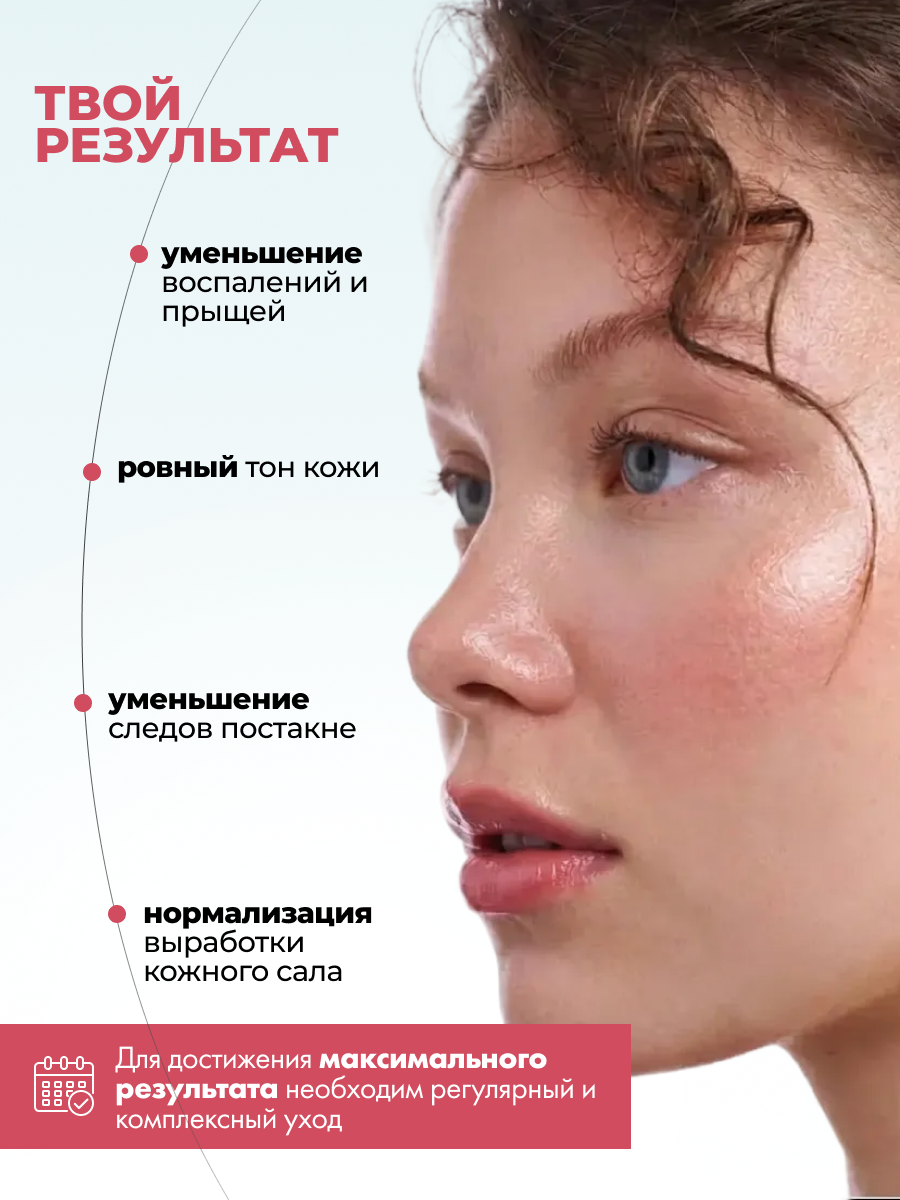 Ниацинамид способствует уменьшению пор, а также улучшению защитных функций кожи. Цинк способен оказывать выраженное себорегулирующее действие. В результате корректирующий крем-гель помогает уменьшить количество несовершенств на коже.
