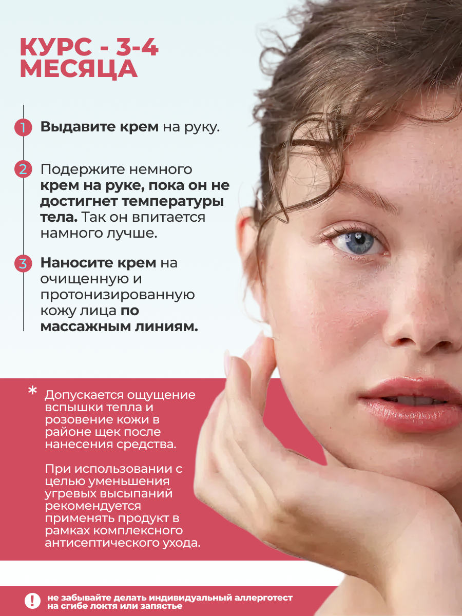 Выдавите крем на руку. Подержите немного крем на руке, пока он не достигнет температуры тела. Так он впитается намного лучше. Наносите крем на очищенную и протонизированную кожу лица по массажным линиям. При использовании в вечернее время суток соблюдать перерыв до сна не менее одного часа.