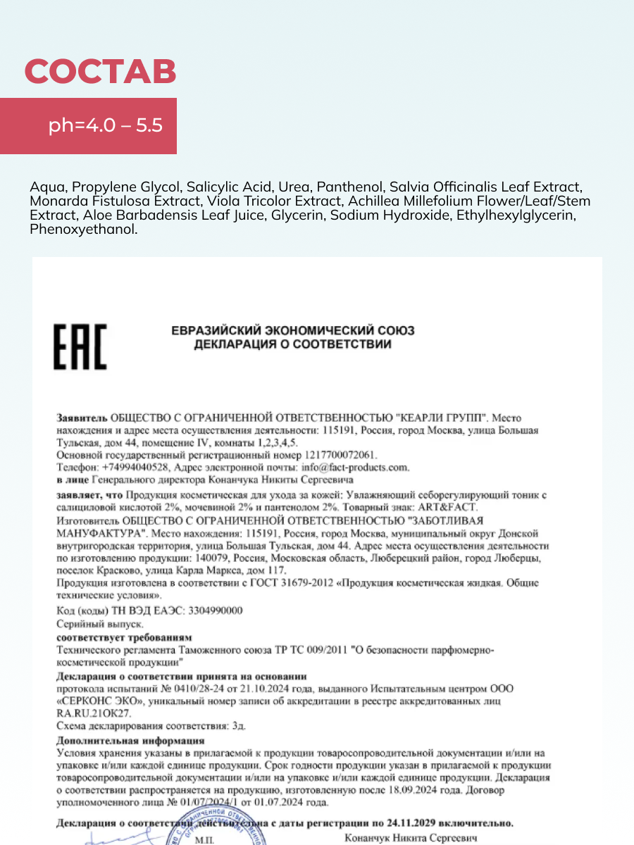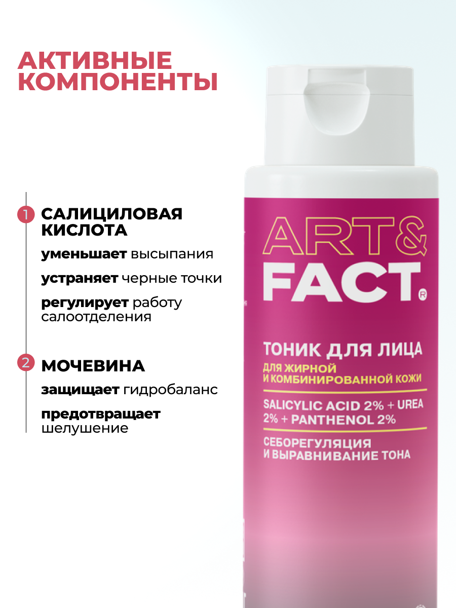 Салициловая кислота способствует выравниванию рельефа кожи, профилактике комедонов и формированию здорового цвета лица. Мочевина относится к натуральному увлажняющему фактору и препятствует потере влаги, обеспечивая глубокое увлажнение. Пантенол придает коже комфорт. В результате тоник помогает ухаживать как за жирной, так и за комбинированной кожей.