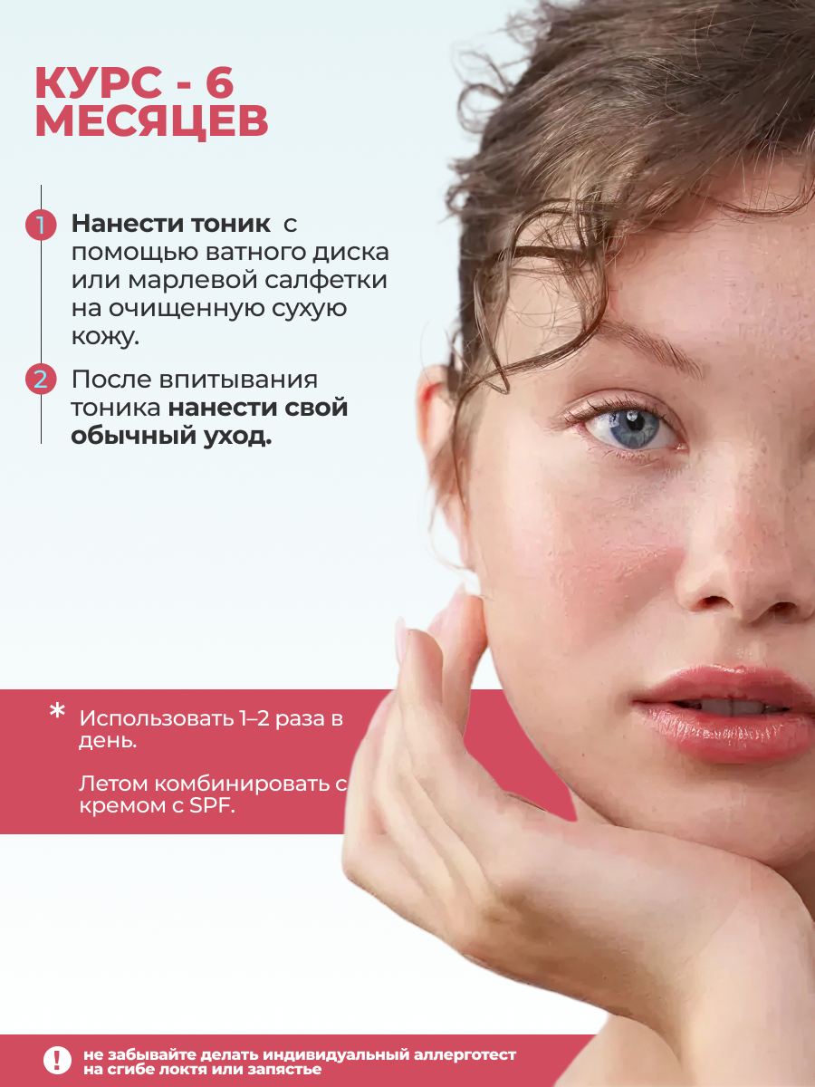 Нанести тоник с помощью ватного диска или марлевой салфетки на очищенную сухую кожу. После впитывания тоника нанести свой обычный уход. Использовать 1–2 раза в день. екомендованный курс — 6 месяцев. Летом комбинировать с кремом с SPF.