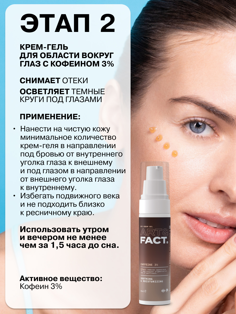 1. Крем-гель для области вокруг глаз с кофеином 3%:Нанести на чистую кожу минимальное количество крем-геля в направлении под бровь от внутреннего уголка глаза к внешнему и под глазом в направлении от внешнего уголка глаза к внутреннему. Избегать подвижное веко и не подходить близко к ресничному краю. Использовать утром и вечером не менее, чем за 1,5 часа до сна.