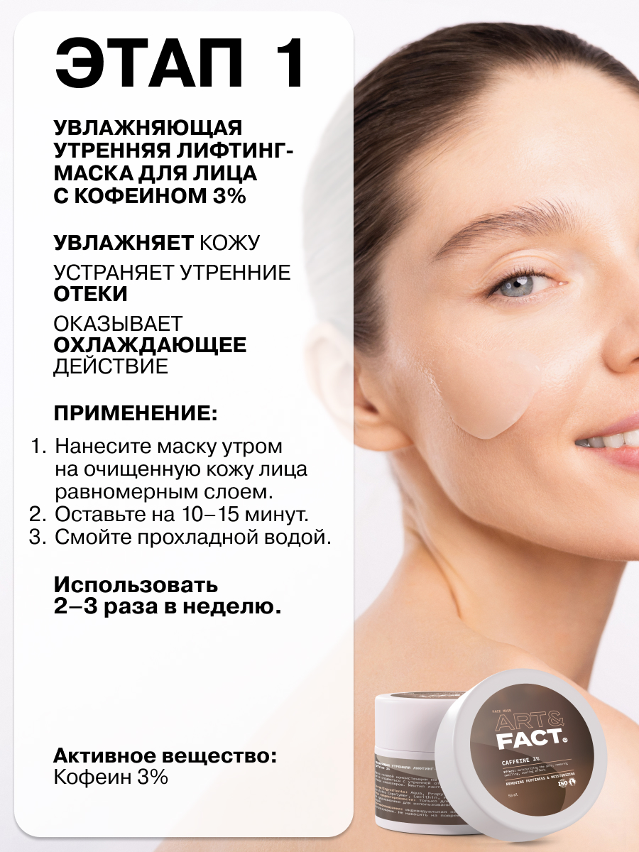 2. Увлажняющая утренняя лифтинг-маска для лица с кофеином 3%: Маска гелевой консистенции не только увлажнит и освежит цвет лица благодаря входящим в состав мочевине и лецитину, но и поможет легче справиться с утренней отечностью. Кофеин устраняет следы невысыпания, а экстракт конского каштана способствует укреплению стенок капилляров. Ментил лактат обладает мягким охлаждающим эффектом и придает свежесть любому типу кожи, включая чувствительный.