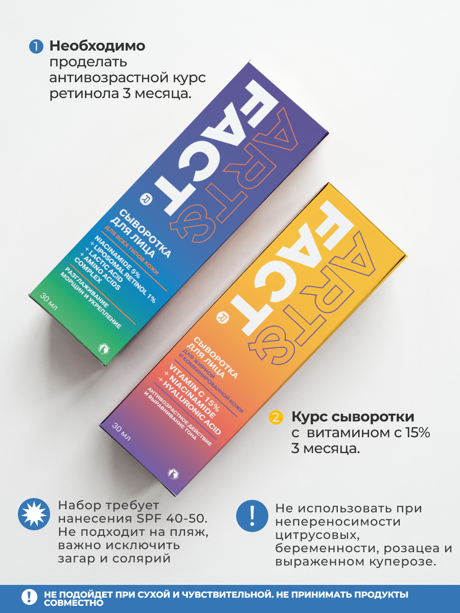 Совместное применение сывороток позволяет добиться выраженного комплексного эффекта: антиоксидантная защита и выравнивание тона от первой сыворотки органично сочетаются с интенсивным антивозрастным действием и восстановлением рельефа от второй. В результате кожа получает всестороннюю поддержку — от глубокого увлажнения и укрепления защитных функций до стимуляции естественных процессов регенерации и заметного сокращения возрастных изменений. Набор идеально подходит для тех, кто стремится сохранить молодость и здоровье кожи, используя синергию активных компонентов.