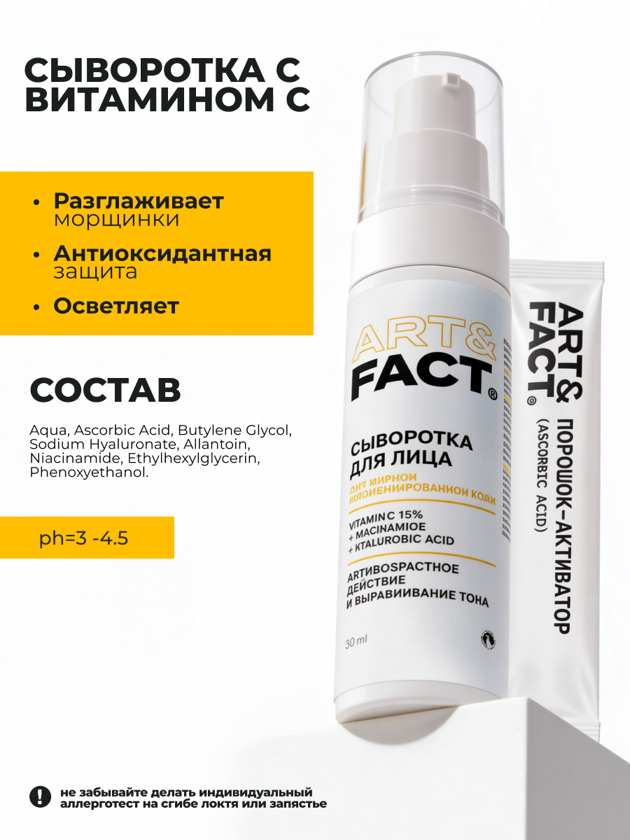 Первая сыворотка содержит витамин C (15%), ниацинамид и гиалуроновую кислоту. Благодаря такому составу она действует как мощный антиоксидант, защищает кожу от негативного воздействия окружающей среды и способствует выравниванию тона лица. Ниацинамид в формуле усиливает защитные функции эпидермиса и повышает эластичность кожи, а гиалуроновая кислота обеспечивает интенсивное увлажнение и восстановление. В результате регулярного применения сыворотка помогает сократить признаки старения, разгладить кожу и сохранить её увлажнённой.