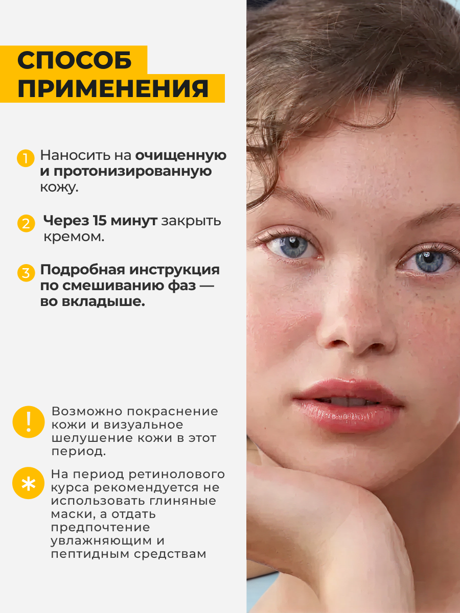 Вторая сыворотка включает ниацинамид (5%), липосомальный ретинол (1%), молочную кислоту и комплекс аминокислот. Её действие направлено на улучшение рельефа и текстуры кожи: ниацинамид способствует выравниванию поверхности, укрепляет барьерные функции и стимулирует синтез коллагена, а липосомальный ретинол эффективно борется с чёрными точками и признаками фотостарения, разглаживает мелкие морщинки и улучшает общий цвет лица. Молочная кислота деликатно отшелушивает омертвевшие клетки, выравнивая пористые участки без пересушивания, а комплекс аминокислот обеспечивает дополнительное увлажнение, восстановление и антиоксидантную защиту.